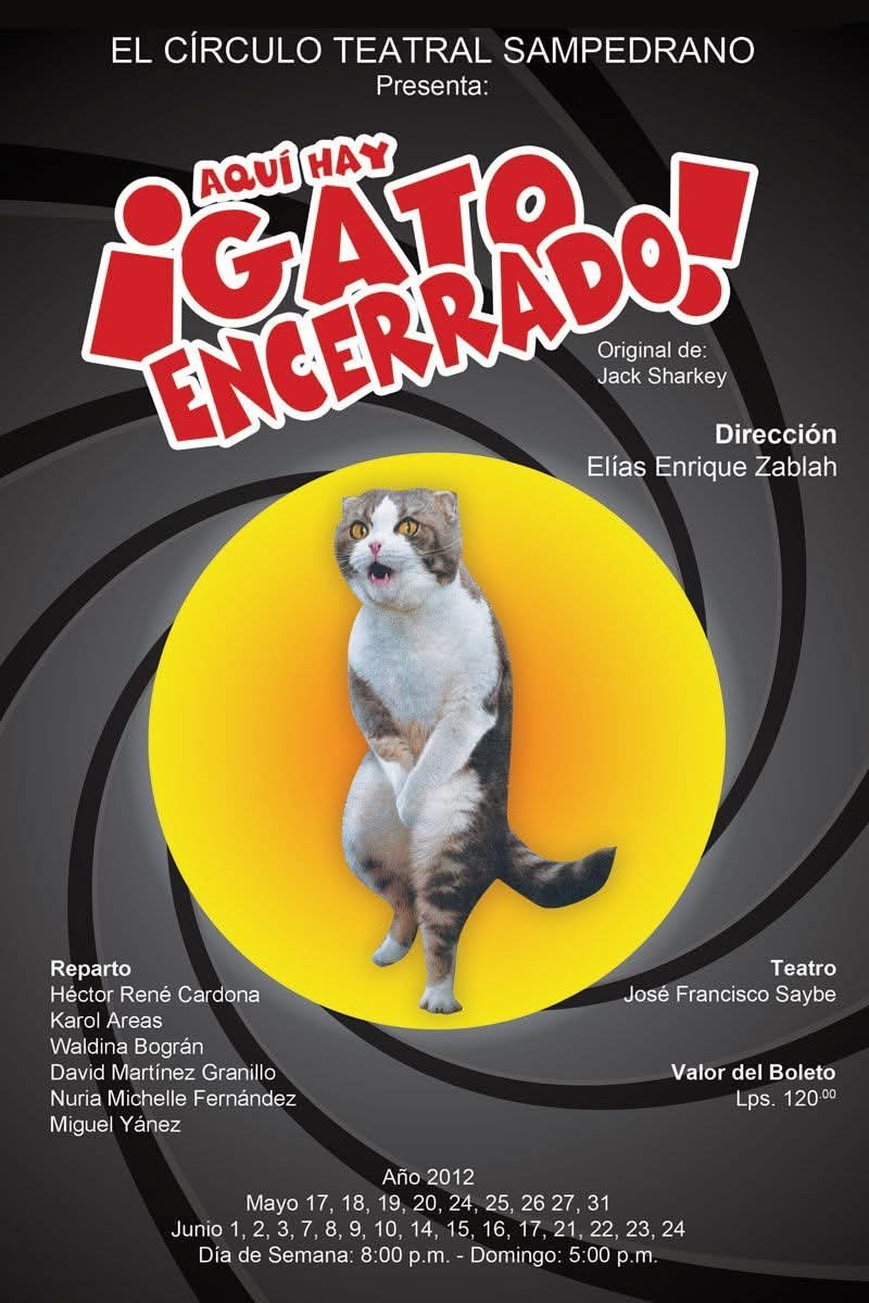 «Aquí hay gato encerrado» se refiere principalmente a una obra teatral de Napoleón Alfaro sobre el acceso al agua en Suchitoto, donde dos artistas se complican al tratar un tema medioambiental y social con la intervención de una inquilina del hostal donde trabajan. Existen también otras obras y espectáculos con este título que son diferentes, como una novela de fantasía, un show de magia que repasa la trayectoria de un artista, o una obra interactiva sobre un asesinato en un restaurante.