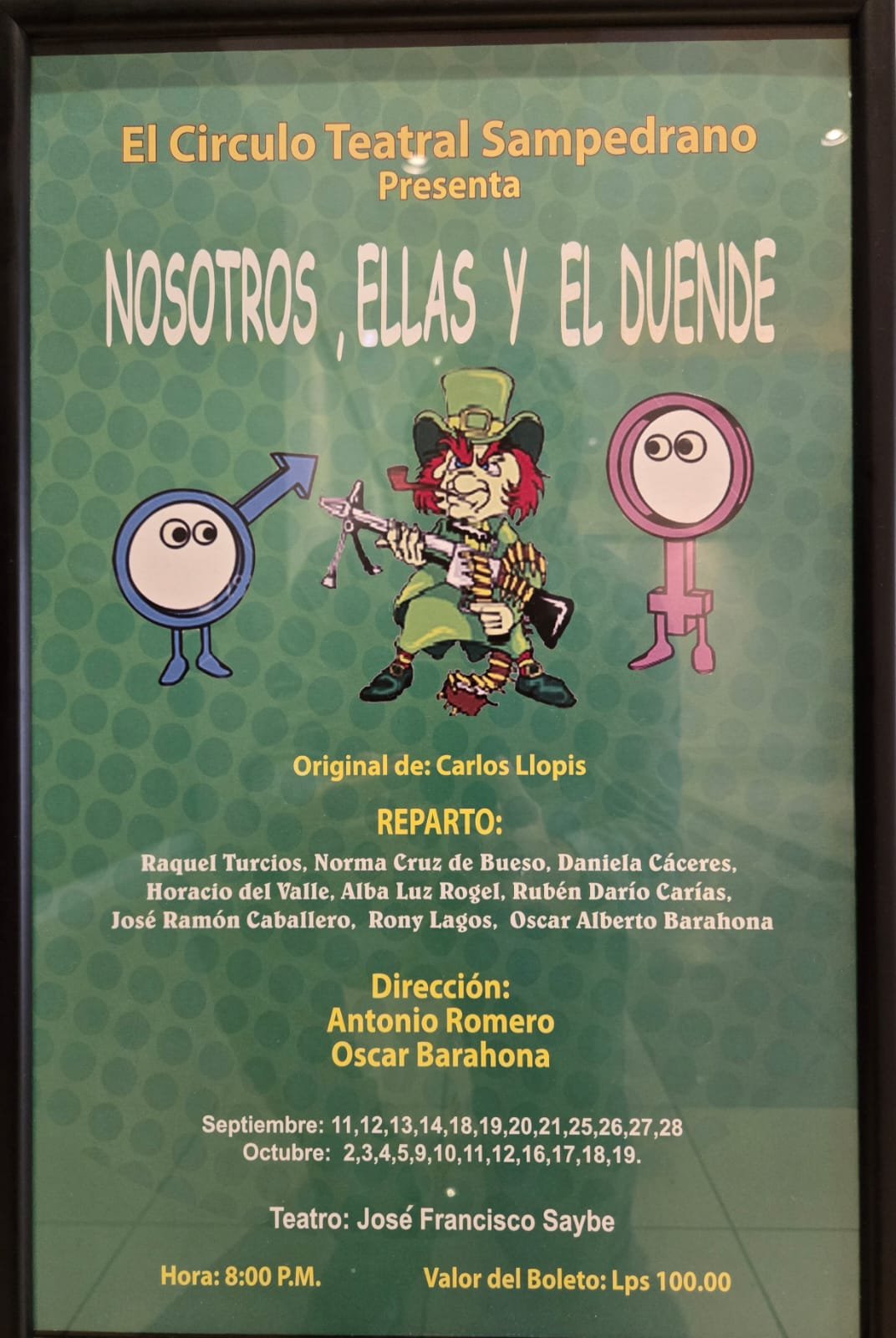 La obra «Nosotros, ellas y el duende» es una comedia teatral escrita por el español Carlos Llopis en 1946, que aborda la idea de la «femineidad» como una fuerza que desafía a los hombres. La trama se centra en el doble enlace matrimonial que ocurre cuando las familias de una pareja de novios se unen. A pesar de que el nombre de Teatro Saybe no aparece como el autor o grupo que presenta la obra, se confirma que se trata de una puesta en escena de la obra de Llopis, con un gran éxito en Madrid y que conserva su ambiente cómico y de lucha de sexos.